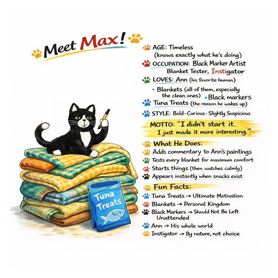 Max is Ann’s cat—an instigator by nature, a blanket enthusiast, and a master of innocent expressions. He loves tuna treats, avoids people, and stays close to Ann.